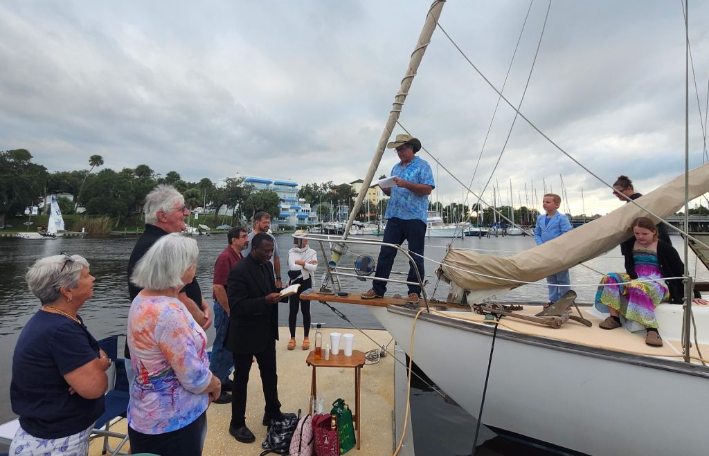 We held the renaming ceremony last Tuesday! Seventeen people attended, including me Linda & Heidi, Linda’s sisters Lisa and Lorie and her four grandchildren, Jaiden, in his blue suit, and Maggie, in her colorful dress, get props from me for best dressed!, my brother George and cousin Sue (both visiting from out of town), three members of the Coquina Ridge Pirates Dave, Rick & Linda, Fr. John Bosco and even a woman who happened to be walking down the dock and stopped to see what was going on. She turned out to be a former sailboat owner—perfect timing!